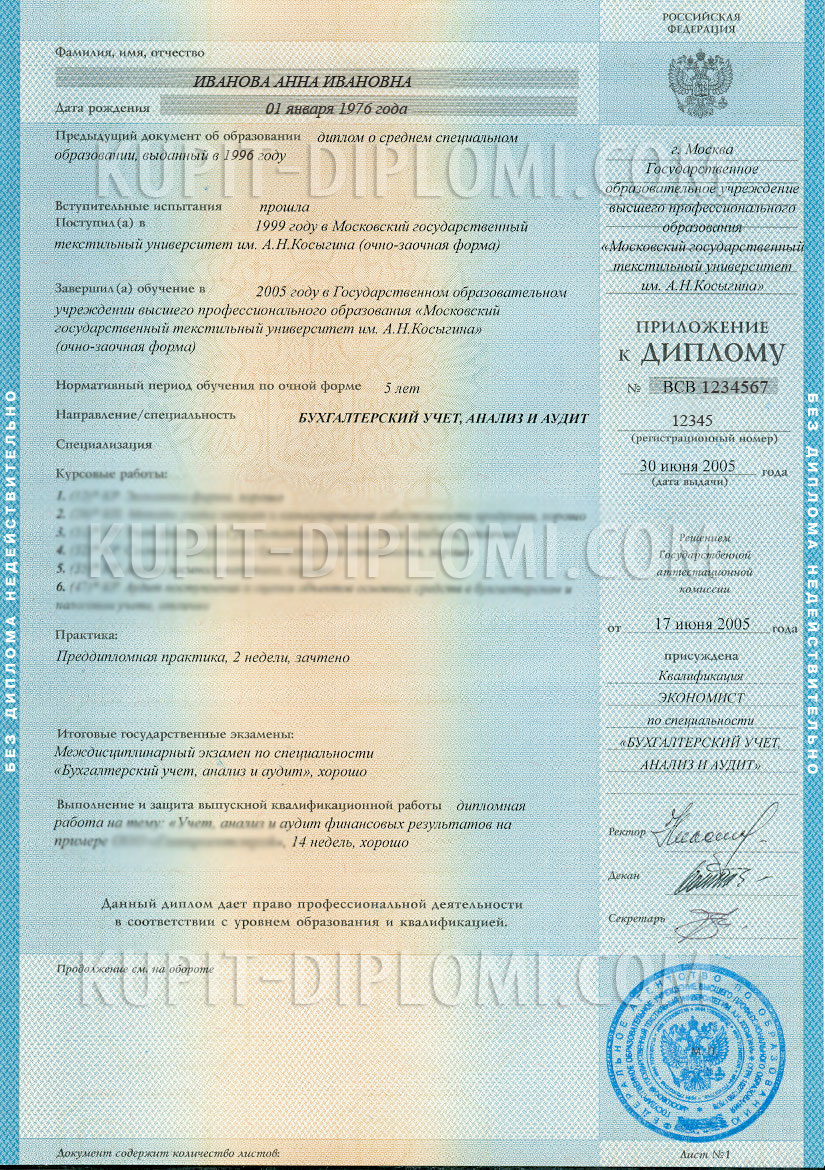 Российские дипломы, выпущенные с 1997 по 2013 года заполняются по единому стандарту. Пример заполнения дипломов нашими специалистами представлен ниже.