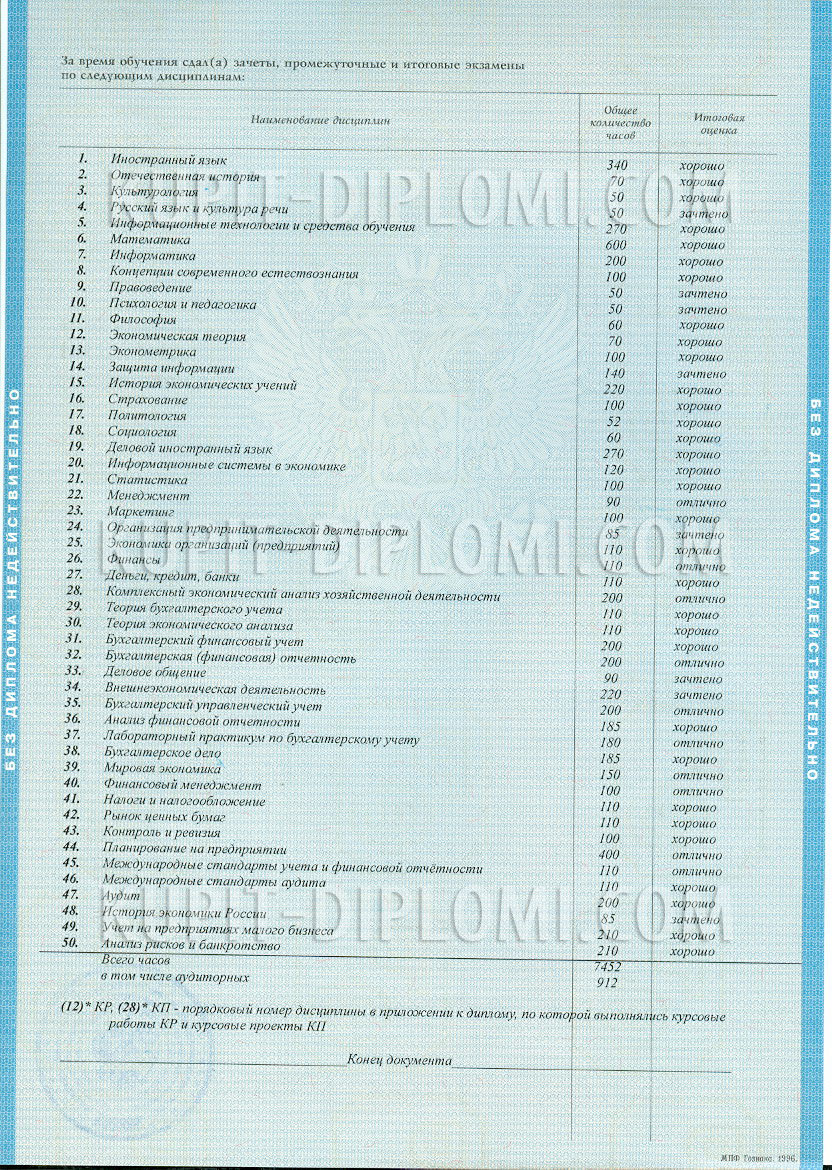На оборотную сторону приложения к диплому вносятся наименования дисциплин федерального компонента ГОС ВПО по направлению подготовки (специальности), по которому заканчивал обучение выпускник. Затем вносятся наименования дисциплин, устанавливаемых вузом (дисциплин национально-регионального компонента, дисциплин по выбору, специальных дисциплин, дисциплин специализаций, факультативных дисциплин), которые могут быть разными для разных форм обучения. По каждой дисциплине, вносимой в приложение к диплому, проставляется общее количество часов (трудоемкость) цифрами и итоговая оценка (прописью). Наименования дисциплин (без кода) и оценок приводятся без сокращений.